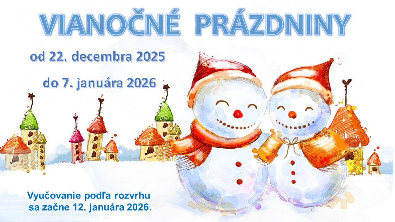 Riaditeľka Základnej školy Jána Amosa Komenského v Tvrdošovciach oznamuje rodičom, že žiaci 1. – 9. ročníka majú od 22. decembra 2025 do 7. januára 2026 vianočné prázdniny.